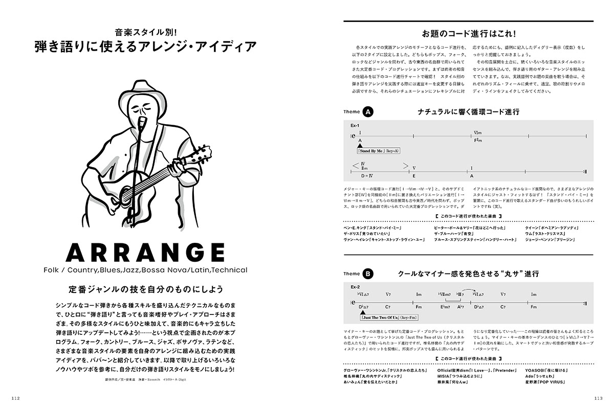 フォーク、カントリー、ブルース、ジャズ、ボサノヴァ、ラテンなど、さまざまな音楽スタイルの要素を自身のアレンジに組み込むための実践アイディアを、ババ~ンと紹介していきます。以降で取り上げるいろいろなノウハウやツボを参考に、自分だけの弾き語りスタイルをモノにしましょう!