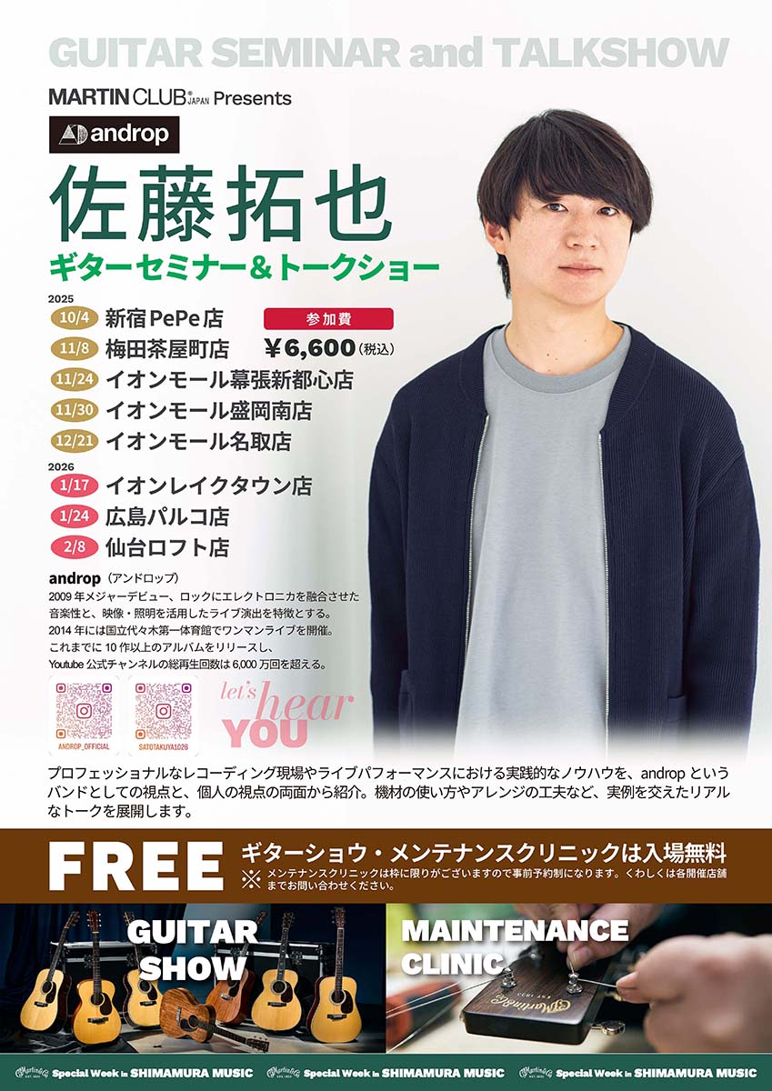 島村楽器の各店舗にて開催中の“Martin Special Week”は、島村楽器がオーダーしたカスタムショップ製モデルが集まるギター・ショーや、マーティン社公認リペアマンによるメインテナンス・クリニックなどが展開されている。その一環としてandropのギタリスト、佐藤拓也によるギター・セミナー&トーク・ショーの開催が決定した。