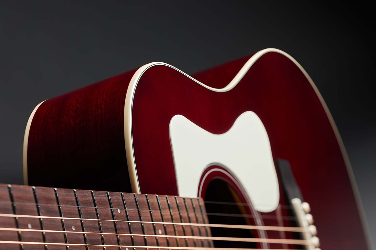 ピックガード/ボディ・カラー以外の基本的なスペックは既存モデルと同様。スロープ・ショルダーのドレッドノート・ボディにシトカ・スプルース単板トップとマホガニー・バック&サイドを採用しており、あたたかく奥⾏きのある中低域と、抜けの良い高域を両⽴し、幅広いプレイヤーに対応する。