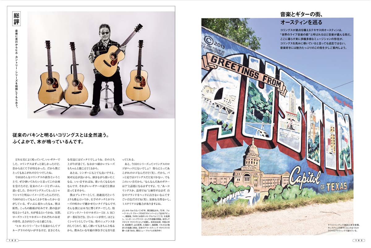 表紙&特集は『山崎まさよしの30年』。山崎まさよしへのロング・インタビューや愛用機材紹介、奏法解説記事などから、彼の30年のキャリアをふり返っていく。現地レポートを含むコリングス特集やタイのギター・ビルダー/工房レポート、奏法特集として12月刊行予定の有田純弘によるリード・シート集『ブルーグラス・スタンダード・ブック』の導入編も掲載。