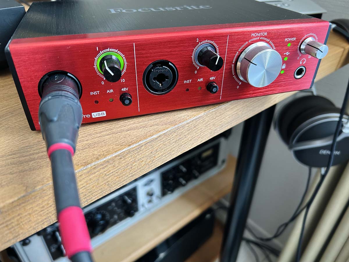 マイクをホルダーにセットしてオーディオ・インターフェースにつなぎ、コンデンサー・マイクの場合はつないだあとに48Vファンタム電源を入れてください。マイクの近くで指を鳴らしてみたりアコギをジャーンと弾いてみると、インターフェースのインプット・インジケーター(緑や赤に光るランプ)が反応していると思います。