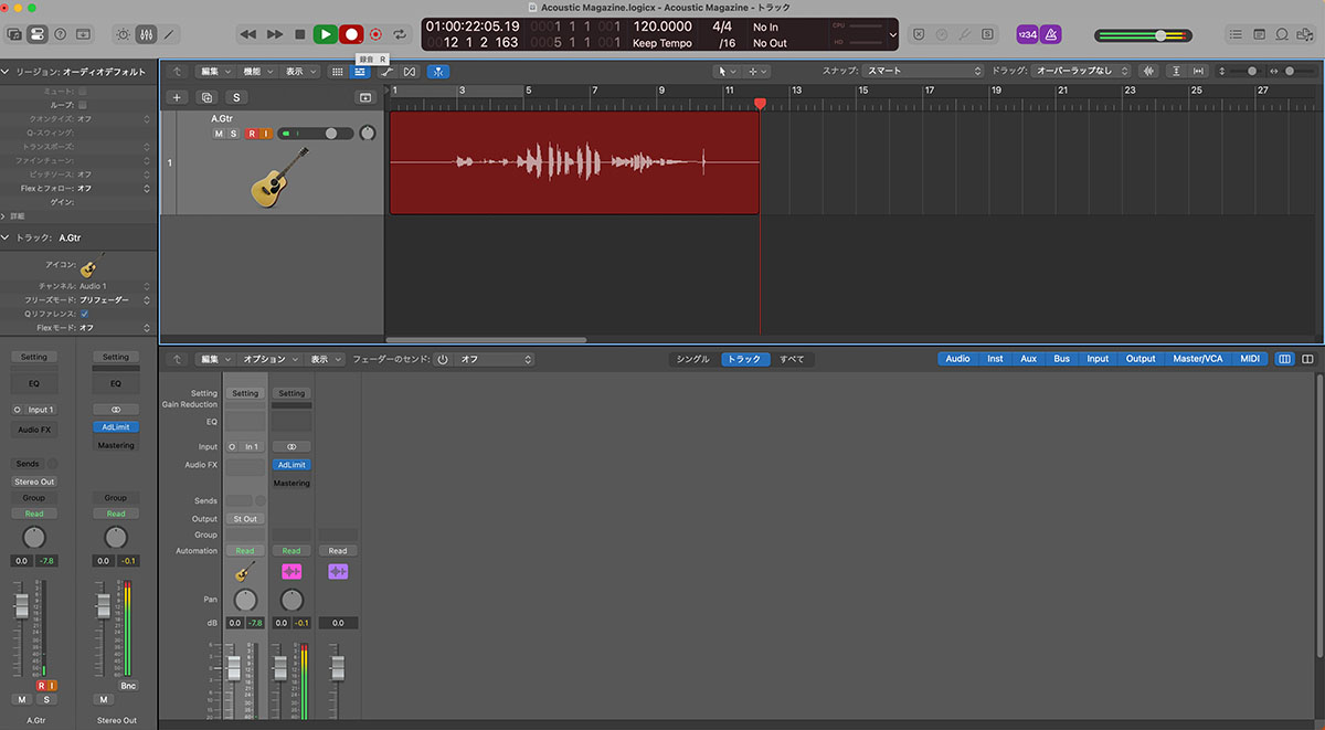 波形に見慣れてくると“これは大き過ぎるな、小さ過ぎるな”というのがわかってきますので、それを元にインターフェースのインプット・ゲインをさらに微調整していきます。レコーディング・エンジニアがスタジオで録音する時も、これと同じように耳だけでなく波形を見ながら調整しているのです。