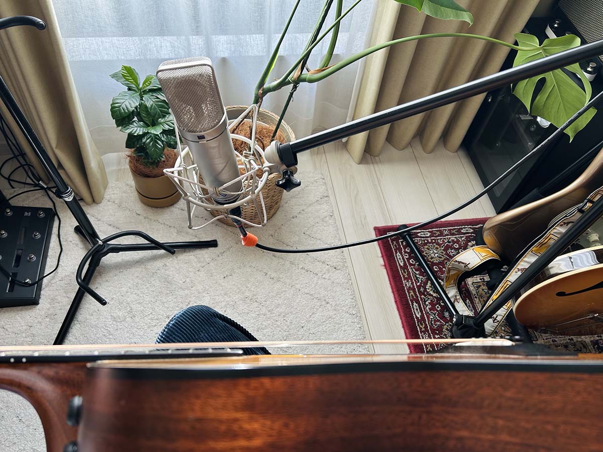 僕がよくやっている基本のマイキングは第2回で紹介しました。サウンドホールの高さにマイクを合わせて、ネック寄りに少しずらし、ギターから拳ひとつ分(約10cm)くらいの位置にマイクを設置します。これは音が近めに録れるセッティングで、あとから音作りがしやすいためこのマイキングをよく使っています。