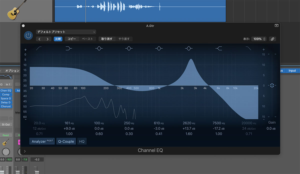 狙う効果に応じてプラグインを挿す順番は変わりますが、録音したアコギには基本的にはまずEQを挿します(ちなみに、エフェクターの場合は“つなぐ”と表現しますが、プラグインは“挿す”と言うことが多いです)。
