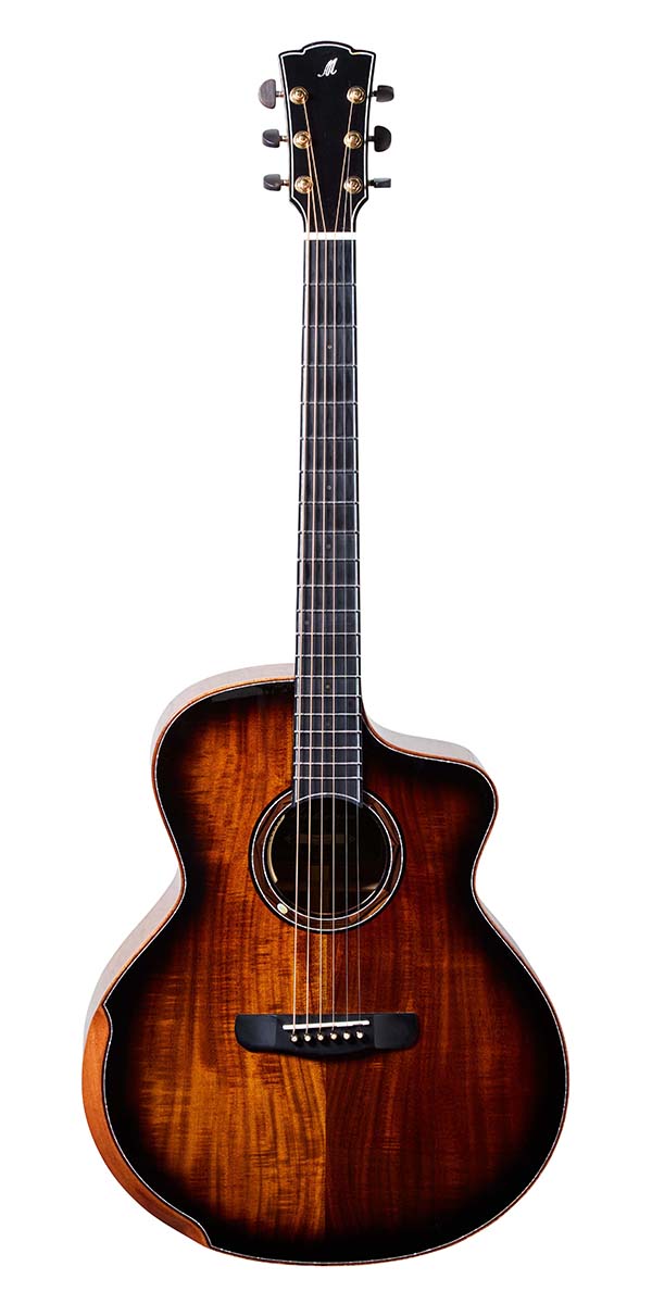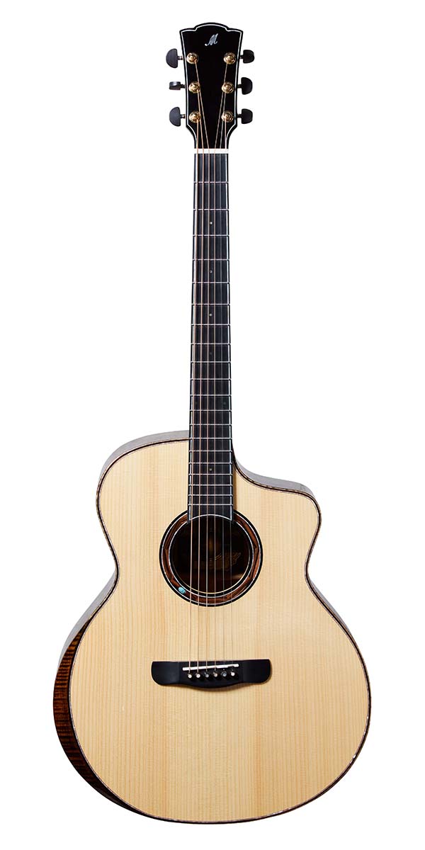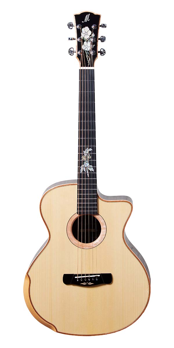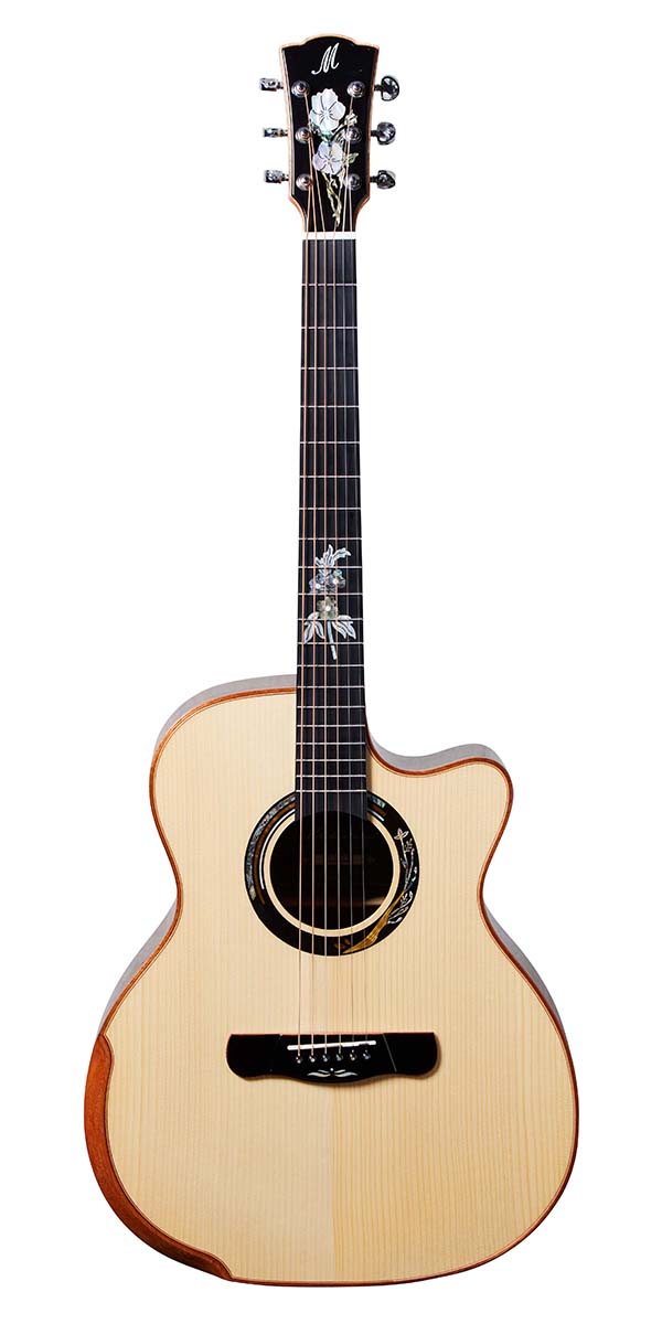 ビヨンド・シリーズのCOBRAは、スプルース・トップにキルテッド・サペリ・サイド&バックのボディを採用した、オール単板のグランド・コンサート・カッタウェイ・モデル。メリダのお家芸とも言えるエルボー部分のベベル・カットや、カッタウェイ、フレットの両端のなめらかな処理など、職人の手仕事により高い演奏性を実現している。白蝶貝の装飾なども見事だ。