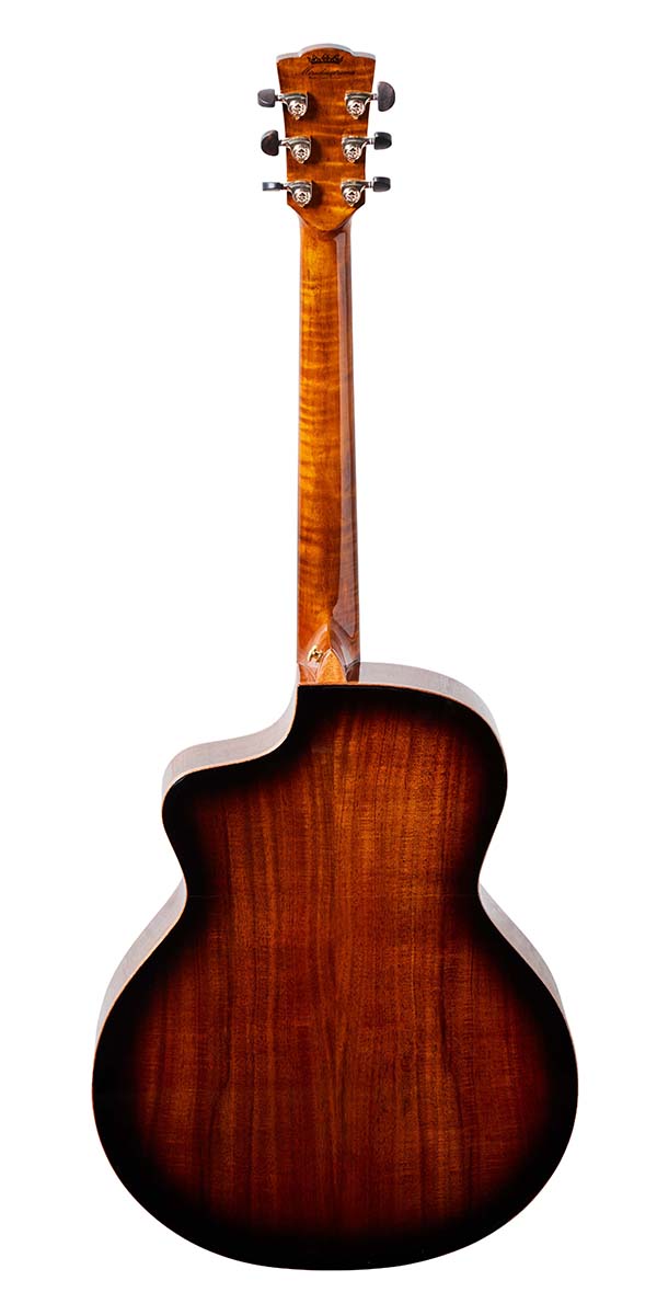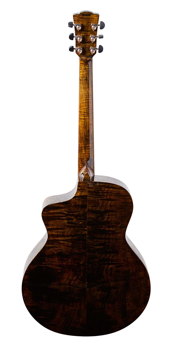 オール単板モデルのビヨンド・シリーズから、コア単板を贅沢に使用したScar。本国ではグランド・ジャンボ・サイズのボディで展開されているが、日本ではWAVEと同様のグランド・オーディトリアム・カッタウェイが採用されている。サンバースト・フィニッシュのコアやネックのフレイム・メイプルなど、美しい木目が際立つ1本だ。すべてのモデルにはピックアップがオプションで追加可能で、写真の個体にはL.R.バッグスのAnthemが搭載されている。