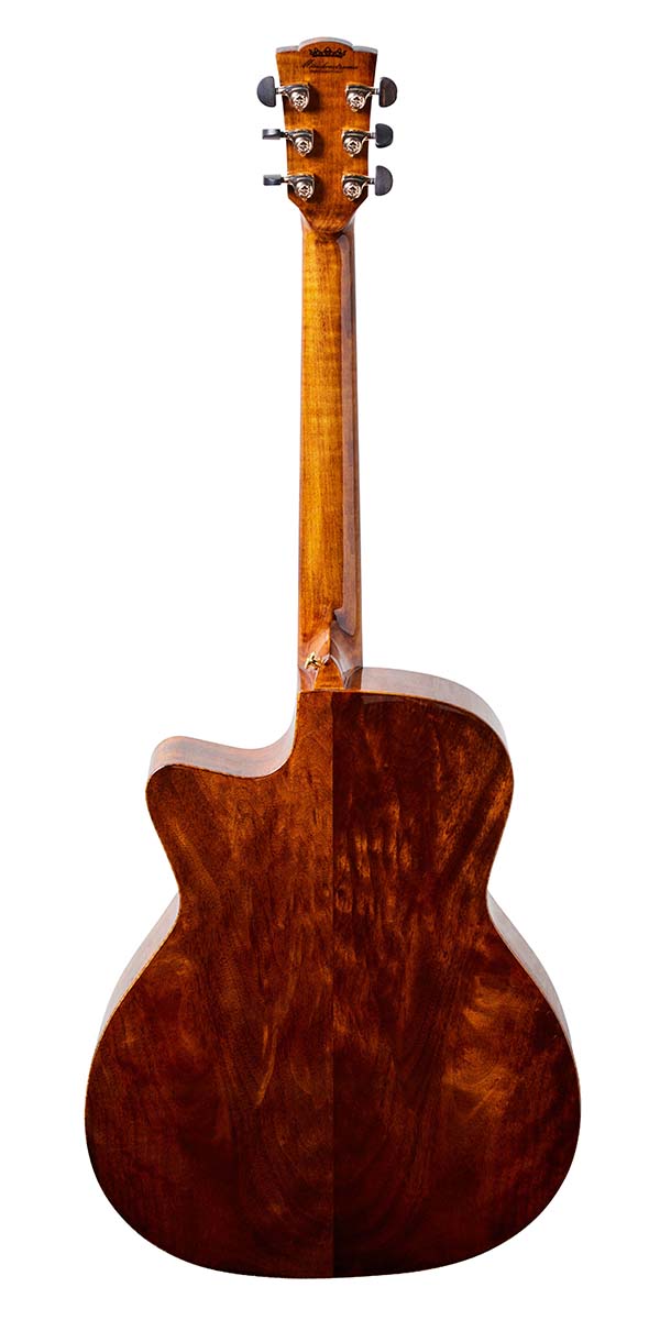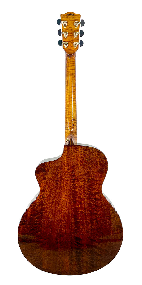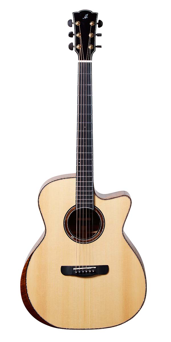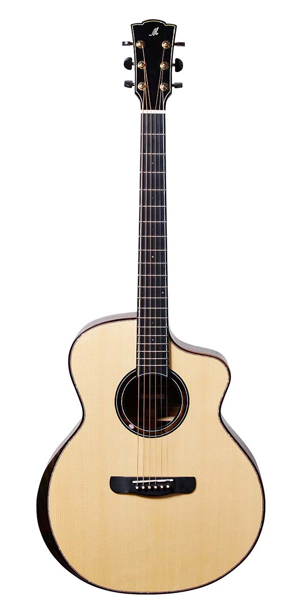 ボディ幅16インチのグランド・オーディトリアム・カッタウェイのWAVEはビヨンド・シリーズに属する、メリダで最も人気の看板モデルだ。最大の特徴は、サイド&バックに高級木材である楠木科のゴールド・ナンム単板を採用している点。ボディ・トップのスプルースと組み合わさることで、ふくよかながらハリのあるサウンドを創出してくれる。写真でロゼッタに入っている天然石は、2025年10月以降は日本向け製品では取り除かれ、より日本人好みのシンプルかつ洗練されたデザインへと変更される。