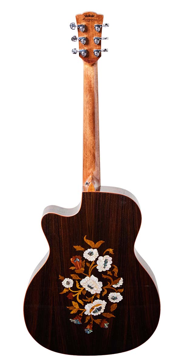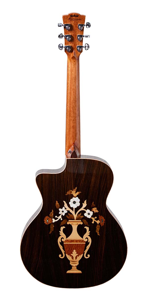 ボディ背面の意匠が特徴的なクラシック・シリーズのA18GAC2。アヴァロンやウッド・マテリアルを組み合わせた豪華絢爛な花のインレイには、職人の手仕事による繊細さが光る。グランド・オーディトリアム・サイズのボディは、トップがスプルースでサイド&バックは目の詰まったローズウッド。バランスの取れた煌びやかなサウンドを奏でてくれる。