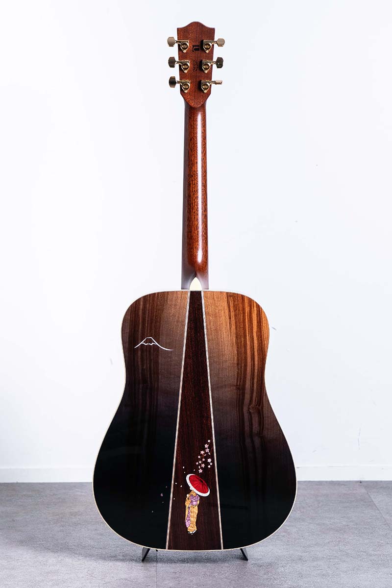 ボディ・トップは黒蝦夷松(くろえぞまつ)で、サイドには富士山麓で育った枝垂れ桜を採用、バックはローズウッドを中央に置いた枝垂れ桜との3ピース構造となっている。富士山や枝垂れ桜をモチーフとしたインレイワークが豪華な1本だ。