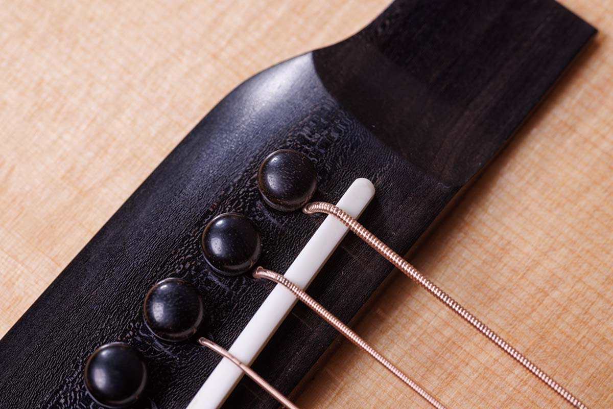 齊藤 ブリッジ部分で弦のテンションを稼ぐ設計の恩恵もあって、適度にハリとコシのある音になっていますね。張られている弦はライト・ゲージですけど、ミディアム・ゲージを弾いているみたいです。ただ、それによって弾きづらいわけではなく、むしろこのテンションの強さが気持ちいい。この音のコシの強さはブルーグラス・ギターではけっこう大事な要素で、こういう音だと低音が潰れないんですよ。
