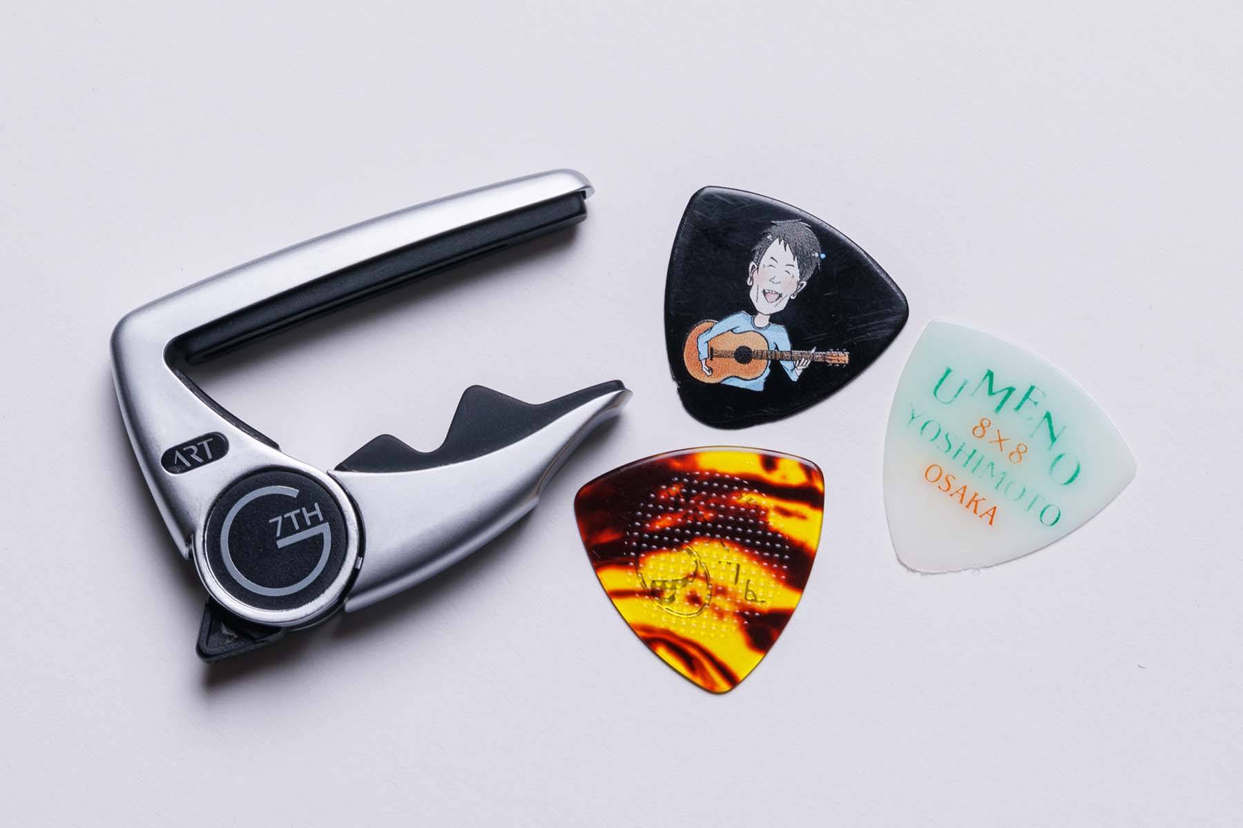 左にあるのはGセブンス製のPerformance 3 ART Capo Silver。ピックは上から時計回りに大平サブローのオリジナル・ピック、平和ラッパ・梅乃ハッパのオリジナル・ピック、イシバシ楽器のオリジナル・ブランド=セルバ製のRubber Grip Pick オニギリ Heavy
