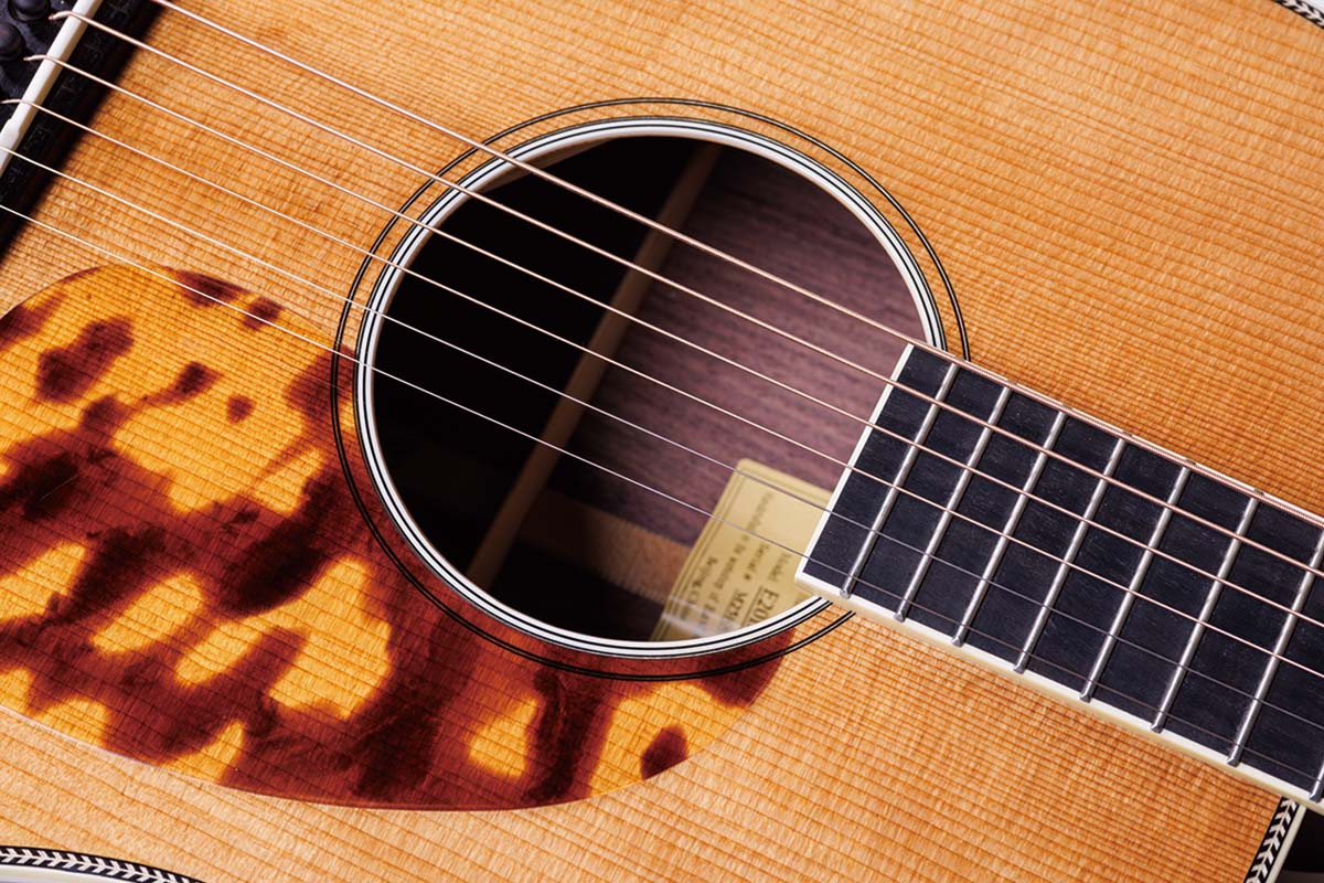 上質なクオリティと高いコストパフォーマンスで人気を集めるイーストマン。フラットトップ・シリーズについては現在、米ボジョア・ギターズと業務提携することで品質が格段に向上している。本器はクラレンス・ホワイトが所有し、のちにトニー・ライスへと引き継がれた1935年製マーティンD-28をオマージュした1本。ヘッド・ロゴや指板上のポジションマークがない点、ラージ・サウンドホールなど特徴的な仕様を踏襲している。特殊な熱処理を施した飴色のアディロンダック・スプルースも印象的だ。