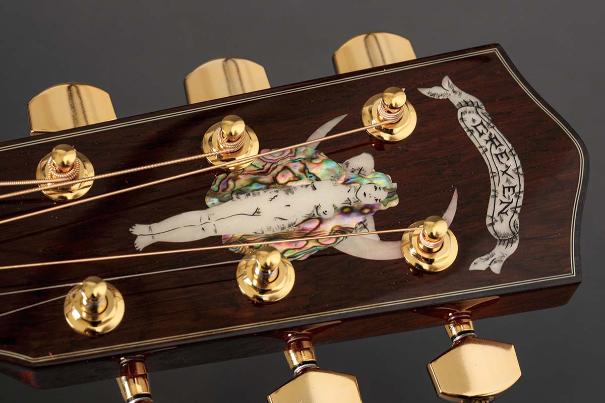 井草 ヘッドに乗った“ホワイト・レディ”のインレイ。これを待ち焦がれていたファンも多いのではないでしょうか? トップの杢目が均一でとてもきれい。サステインがしっかり長いのはこのルッツ・スプルースの賜物でしょうね。音のレンジがとても広くきらびやかなんですが、塊になる印象もあるので、ストローク系のソロ・ギターに合うと思います。ネックはハイポジションが薄くなっているモダン仕様。ナット幅も広すぎず、いろんなスタイルで弾けます。