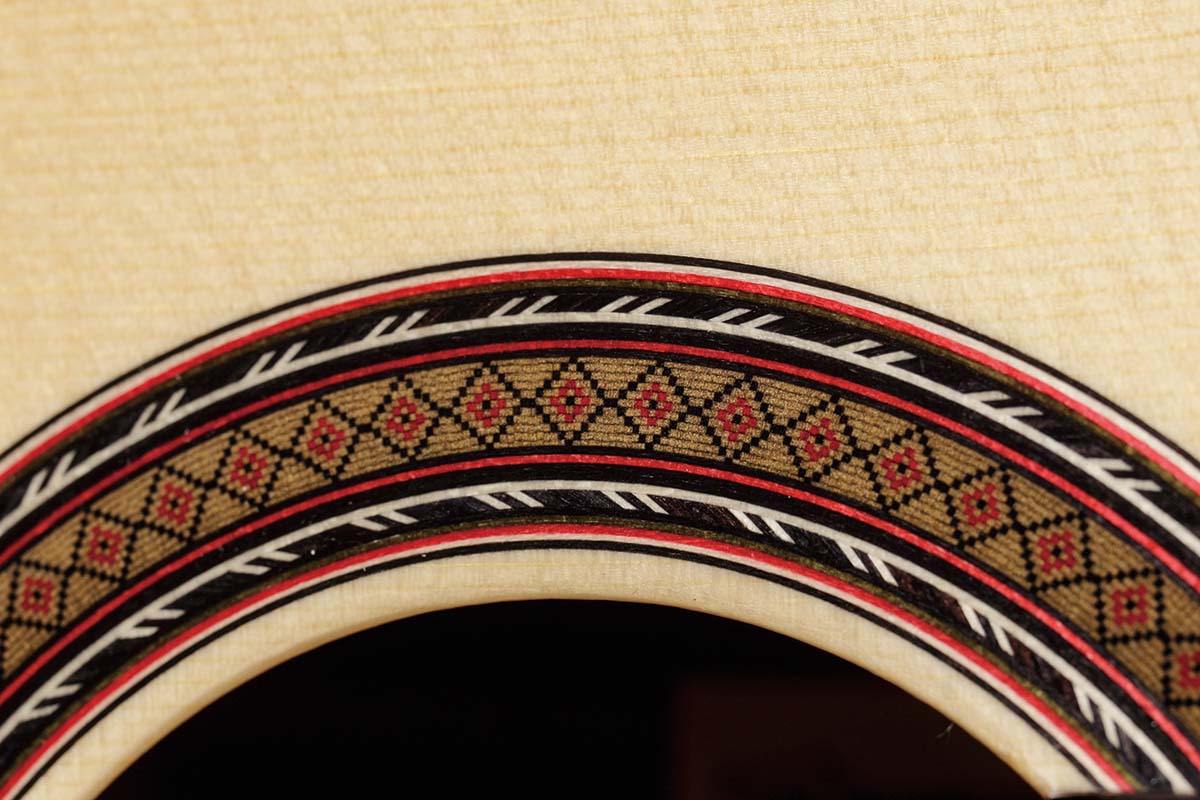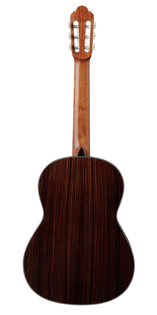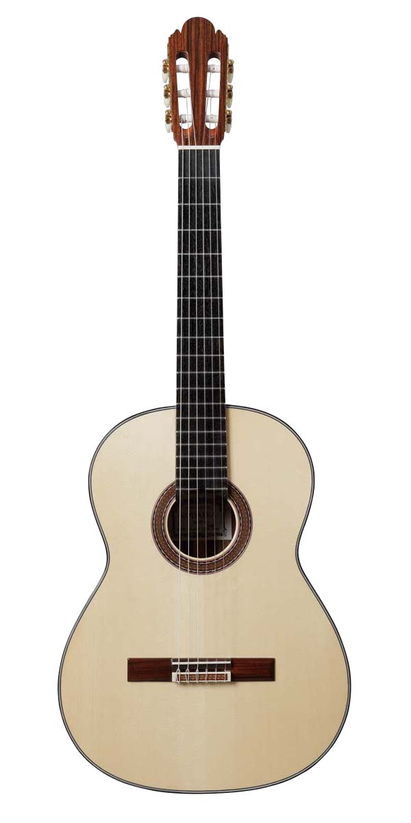 ハンドメイドながらもコスパに優れた本格クラシック・ギターで定評のある小平ギター。こちらは“630mmではもの足りないけど650mmでは弾きにくい”という人におすすめの640mmスケール仕様のモデルだ。スプルース・トップによる、遠くまで音が飛ぶ輪郭のはっきりしたサウンドが特徴。ロゼッタやブリッジのひし形模様の装飾が落ち着きと貫禄を感じさせる。