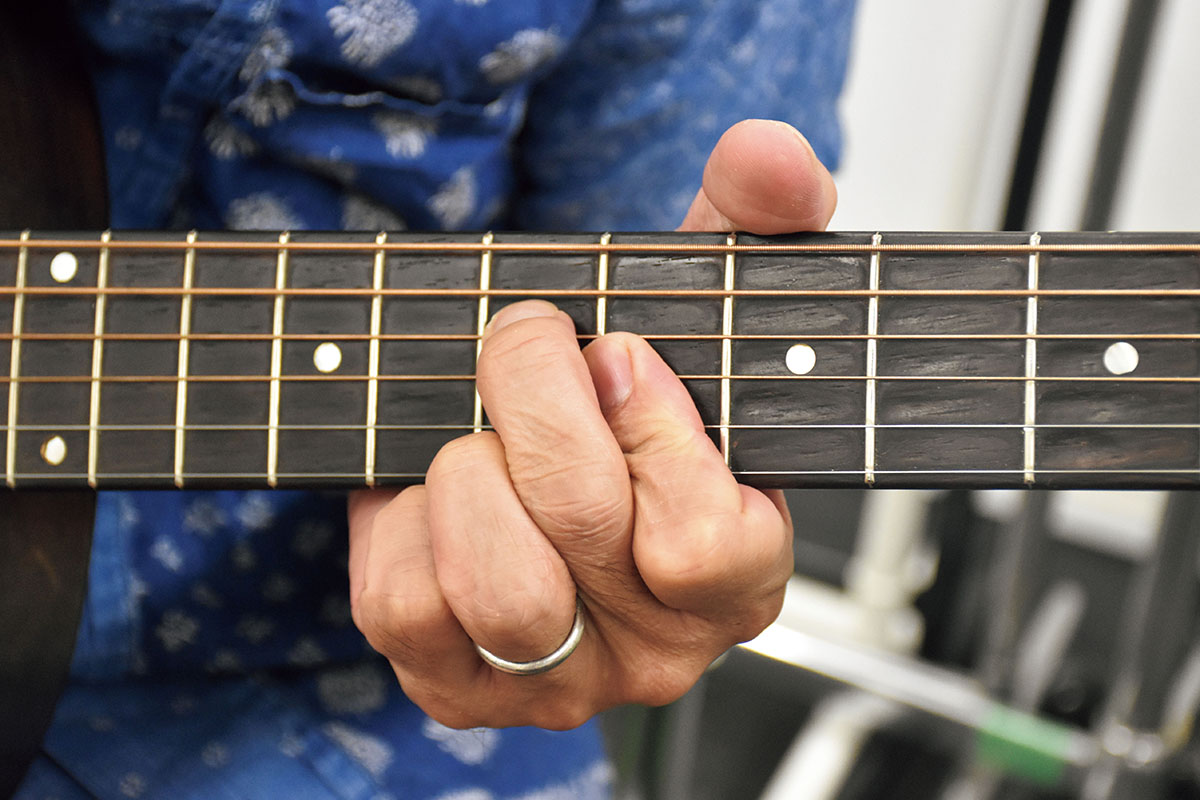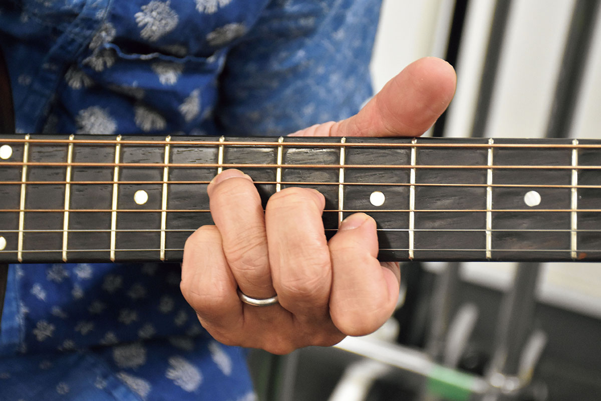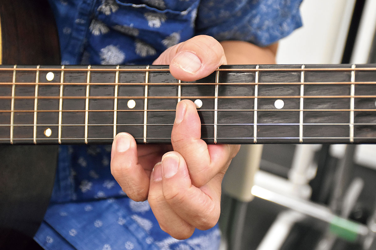 頭はAadd9ですけど、6弦のEも弾いてしまっていいんです。最近気づいたんですけど(笑)。AのコードにはEの音も入っているから、6弦開放のEを鳴らしたら、よりふくよかになる。次のD△7のコードも、同じように5弦開放のAが鳴っていていいです。