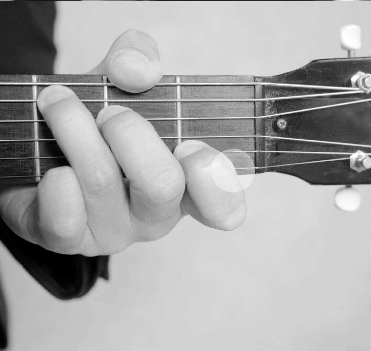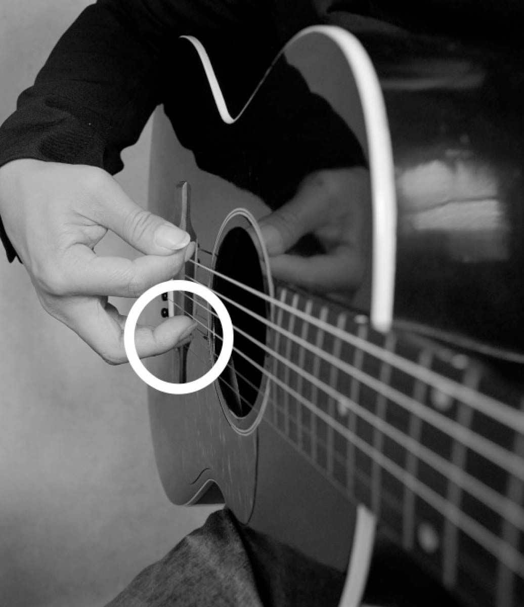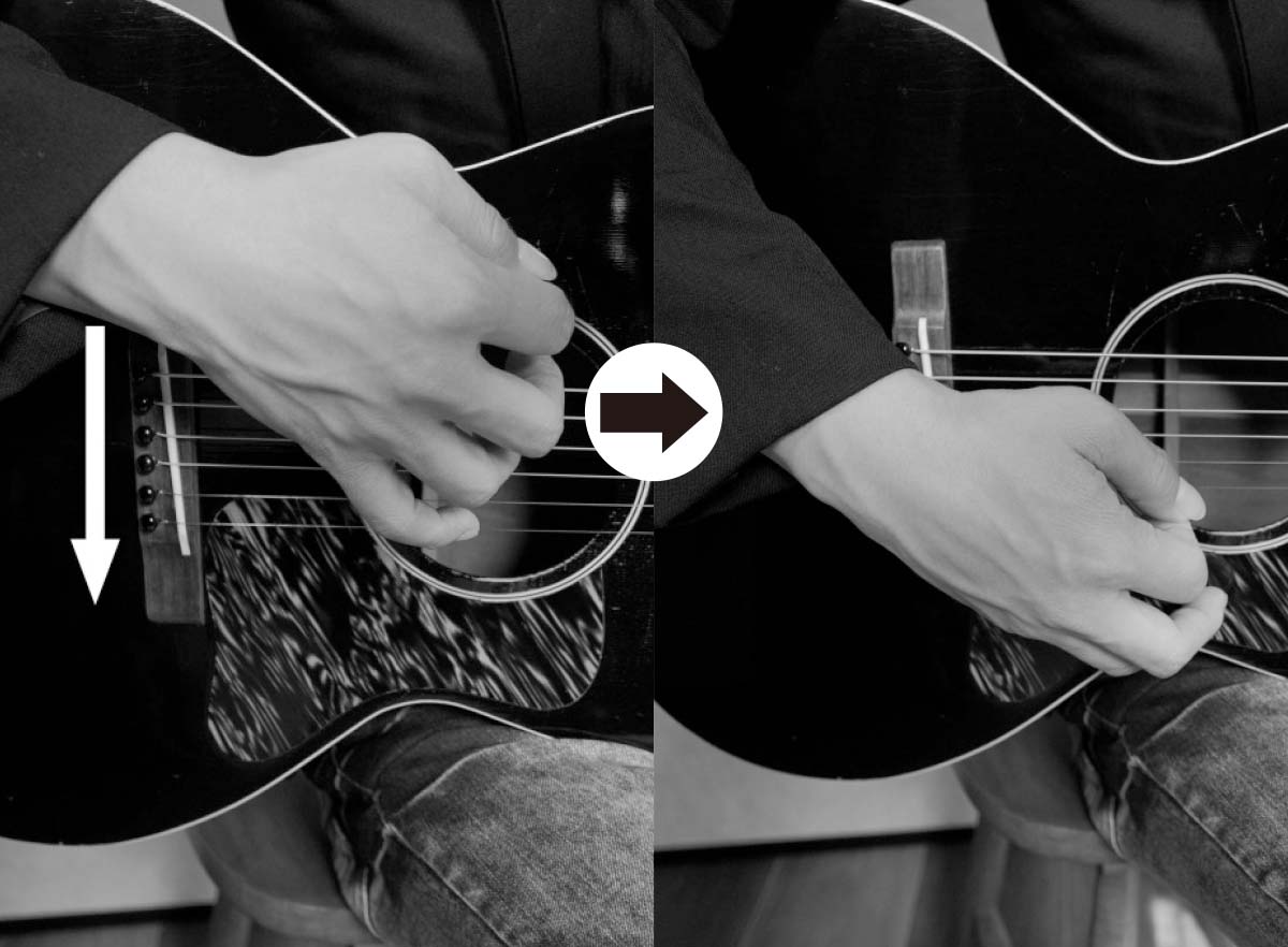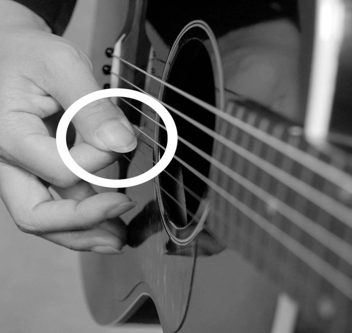 人差指には親指を添えておき、最後の弦を弾くタイミングに合わせて親指と人差指をギュッとつまむようにすると、最後の弦だけ少し音量を大きく鳴らすことができる(写真③)。
