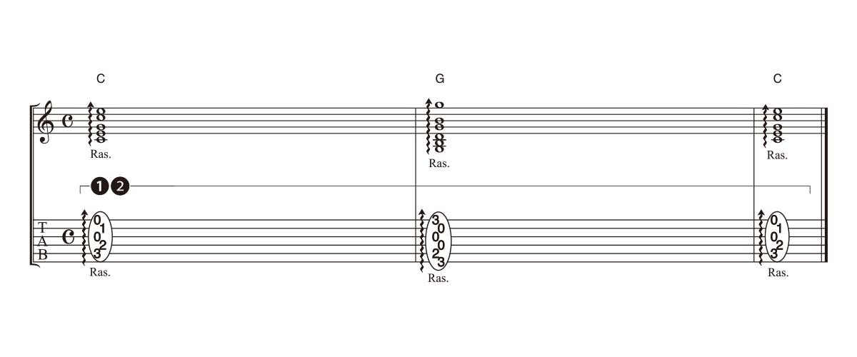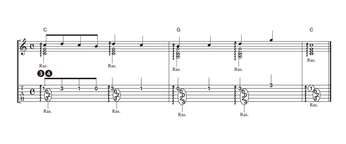 ストロークの音により厚みを加え、華やかに聴かせる“ラスゲアード”奏法にチャレンジしよう! 普通のストロークでは人差指や親指など1本の指を使って演奏するが、それを(小指)、薬指、中指、人差指の3本(または4本)を使って、少し音をずらしながら順番にストロークをし、音を重ねて演奏する。これがラスゲアード奏法だよ!