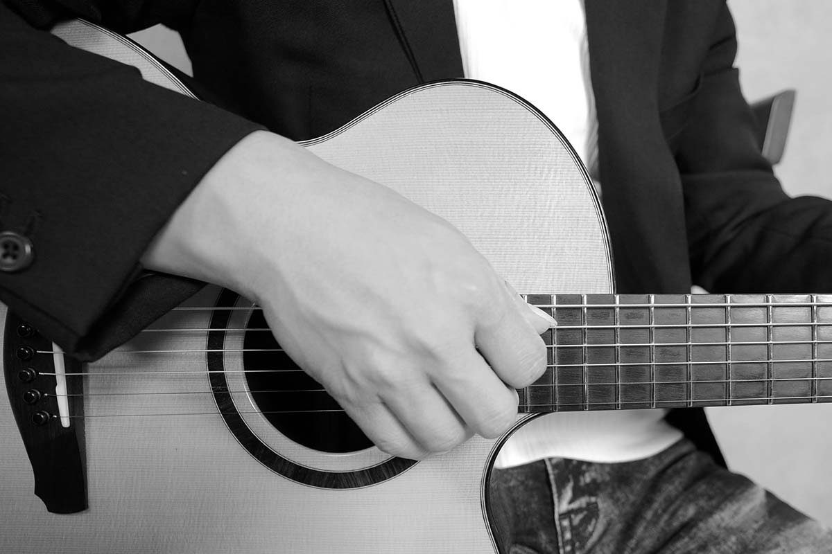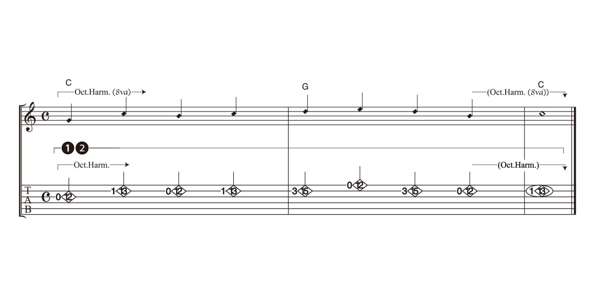 コードやメロディを押弦したまま、押弦したフレットから12フレット先などのハーモニックス・ポイントでもハーモニックスを鳴らすことができるため、どんな音でもハーモニックスにできるよ! それでは挑戦してみよう!