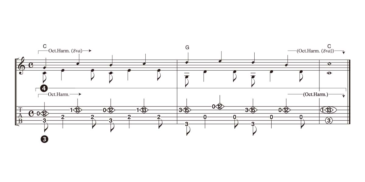 今回はハーモニックス・ポイントに人差指を触れているが、中指でもできるようにするとさらに多彩なフレーズが可能になるのでチャレンジしてみよう。