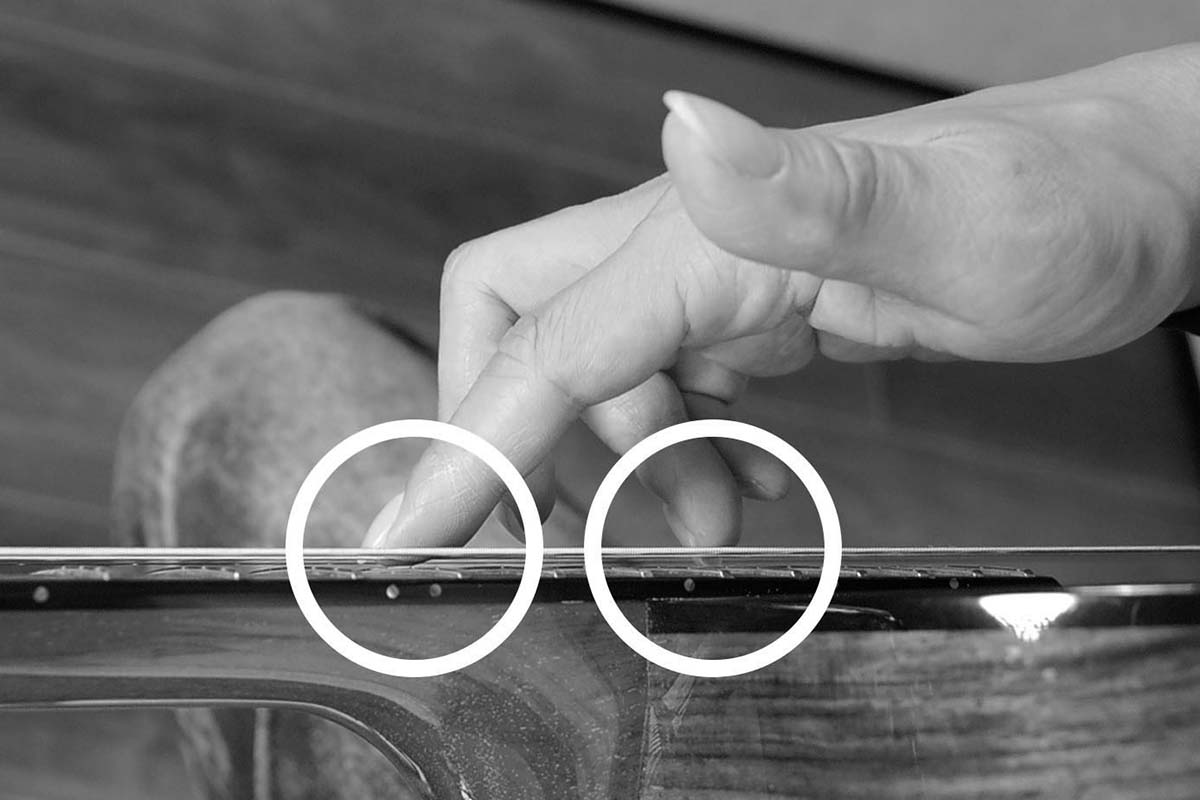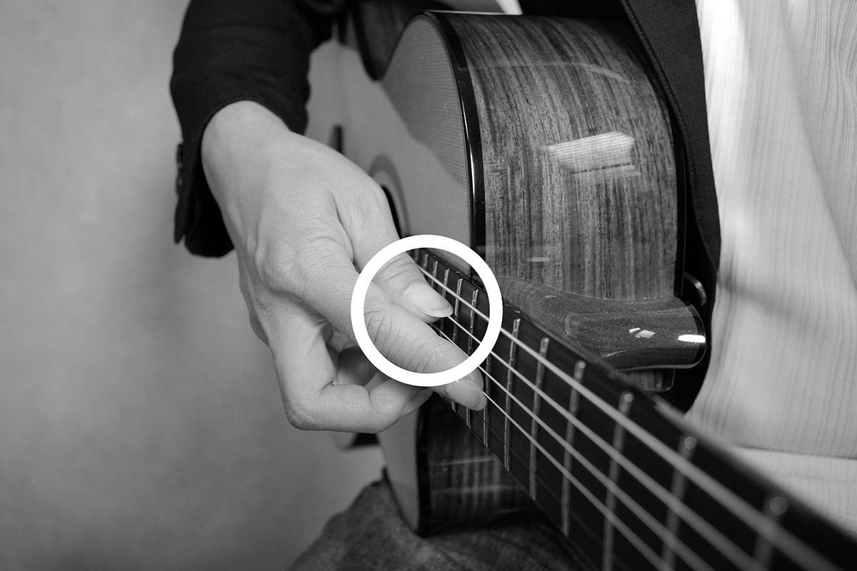 ピッキングする際、触れている人差指からできる限り離れた位置でピッキングすると、ハーモニックスを響かせやすい(写真②)。